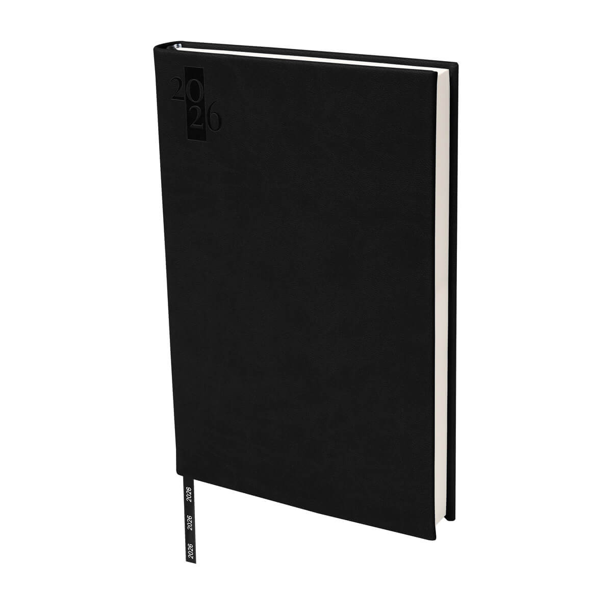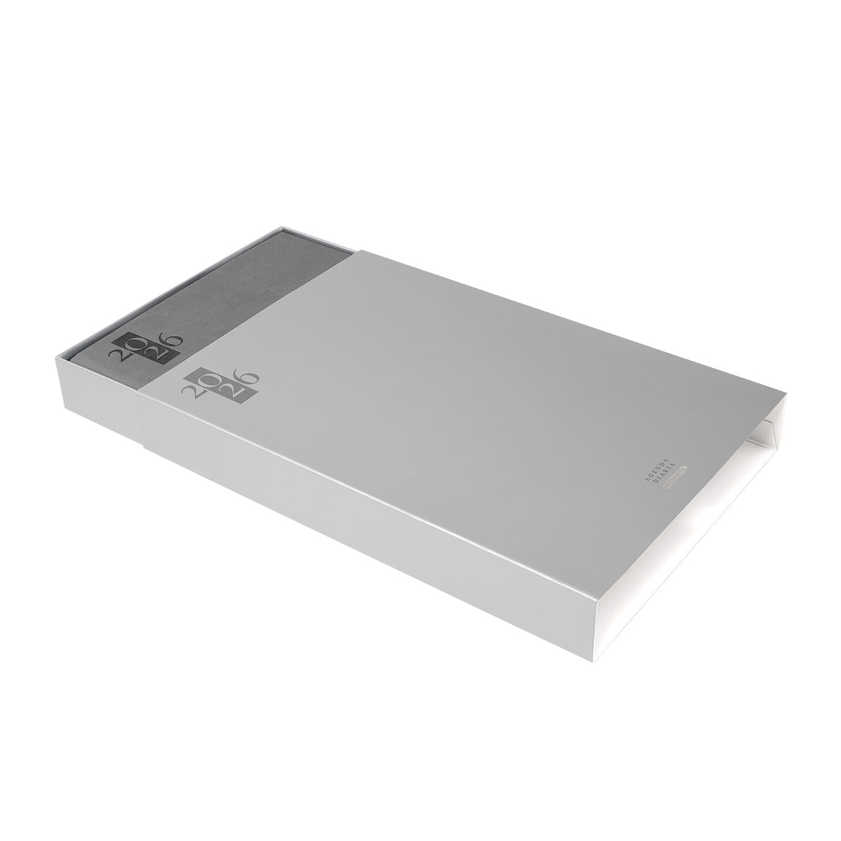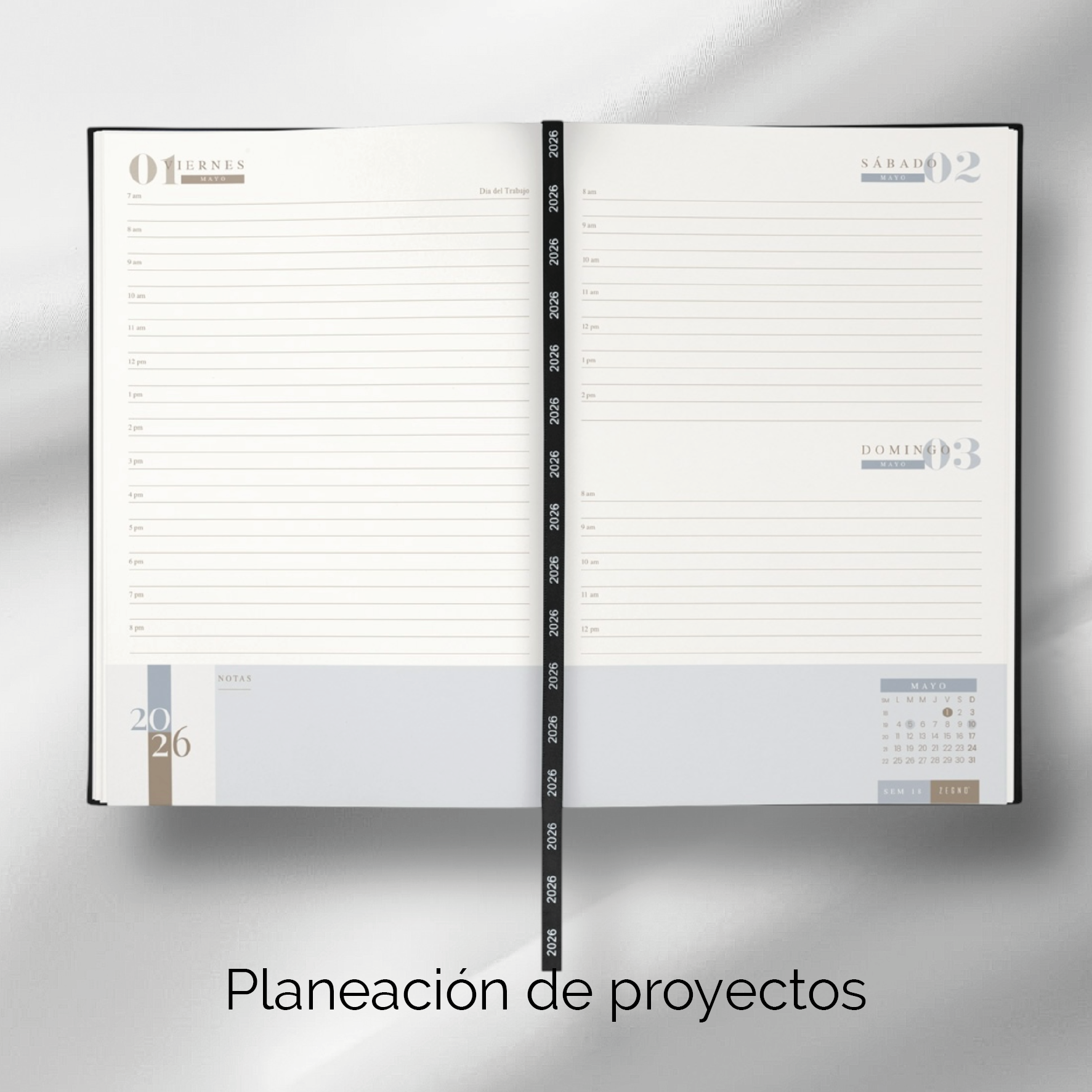 Agenda diaria con 186 hojas. Contiene datos personales, calendarios 2025-2026-2027, planeador 2026, presupuesto de gastos, seguimiento de nuevos hábitos, organizador de tareas, planeador de proyectos y días festivos. Incluye caja individual.